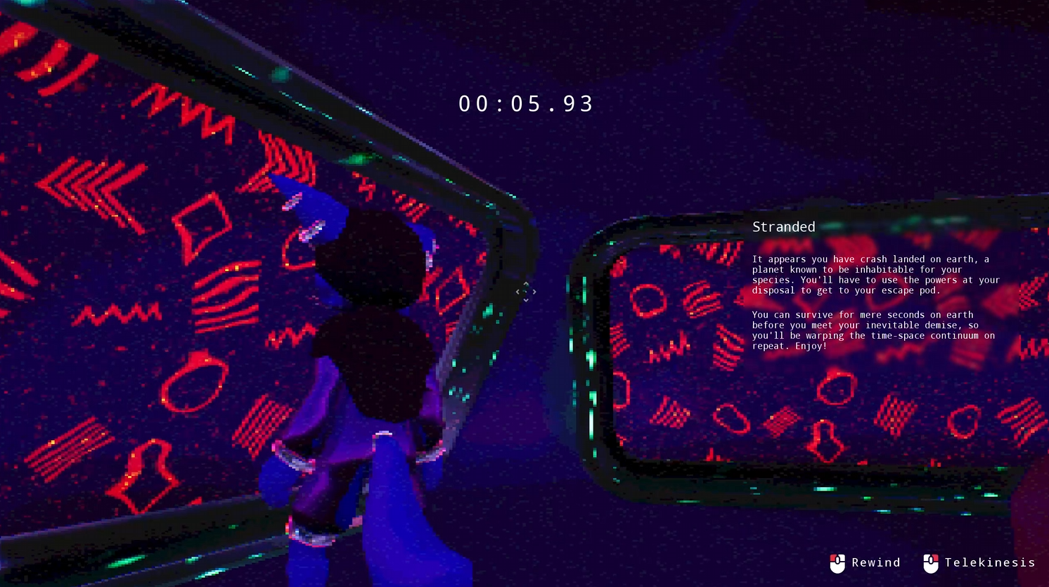 A short, retro-style 3D adventure game where you have to reach the escape pod of your spaceship where all systems are offline after you have crash landed on planet Earth. You have two powers at your disposal to reach your goal: rewinding time, which leaves an echo of yourself in your place, and telekinesis.